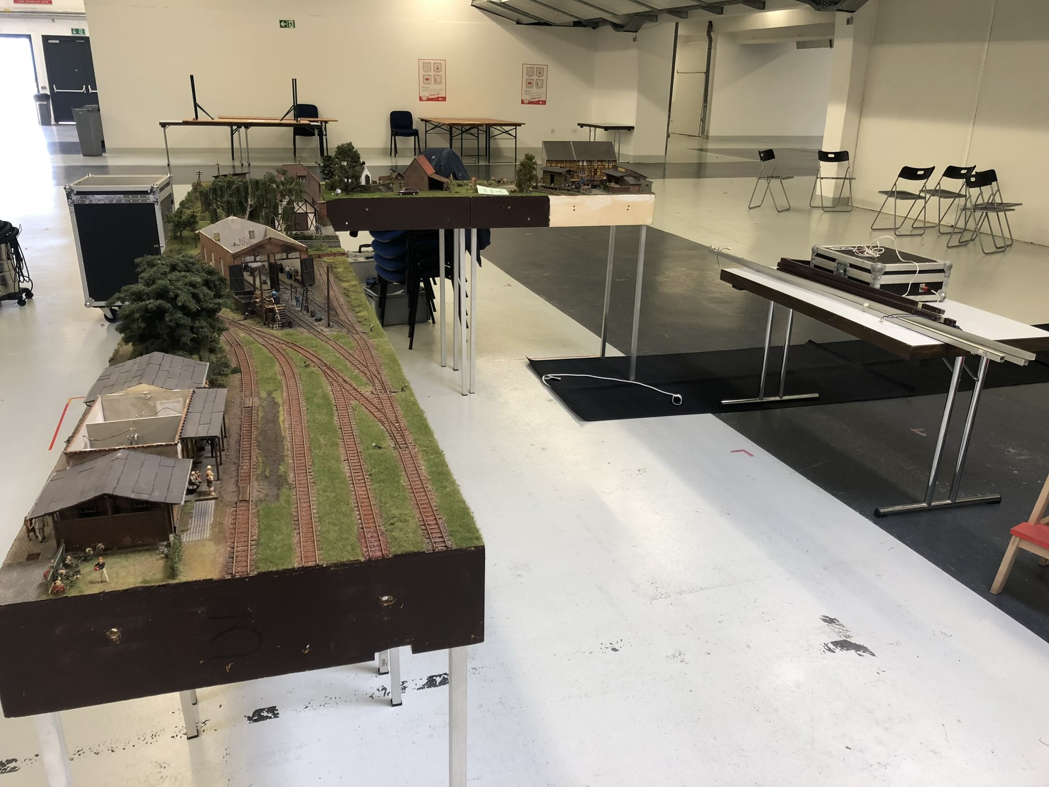 Der erste Messetag kann beginnen. Nach den ersten Probefahrten mussten manche Übergänge noch nachjustiert werden, da heute Morgen in der Halle die Heizung an war. Unsere Module sind nun mal aus Holz, und Holz reagiert auf Veränderungen in Temperatur und Luftfeuchtigkeit. Daher war zu erwarten dass manchen Übergänge nicht mehr passen.
