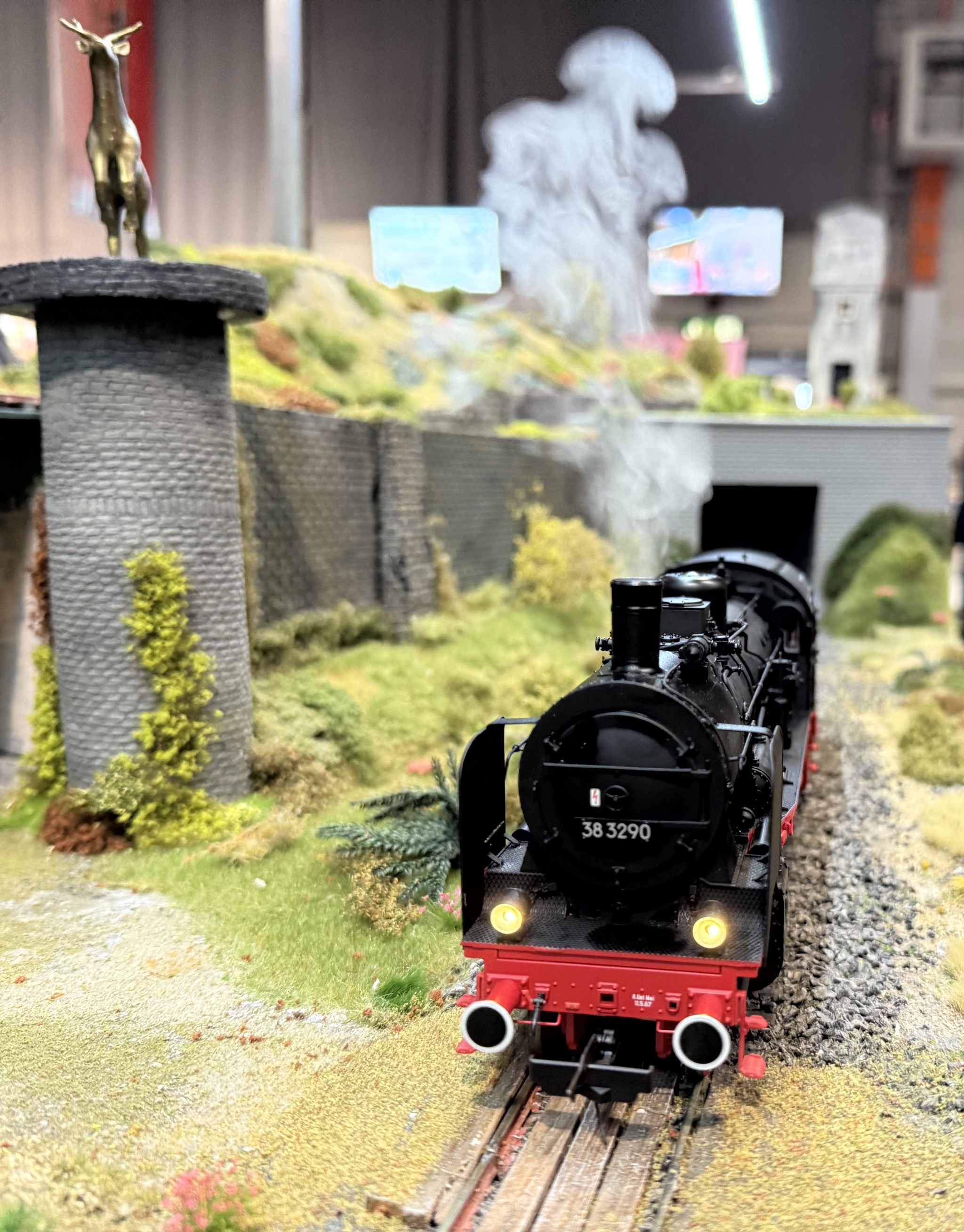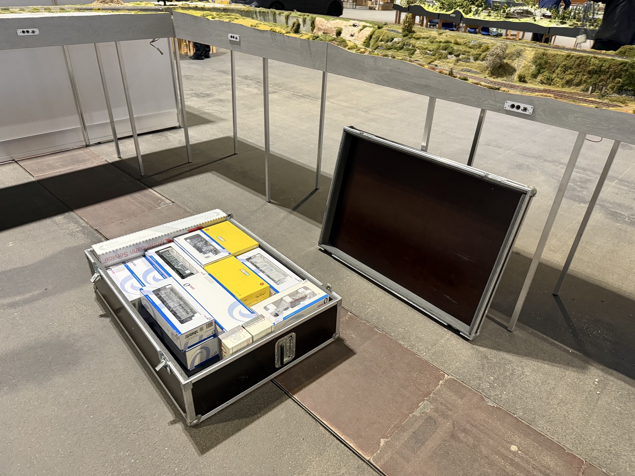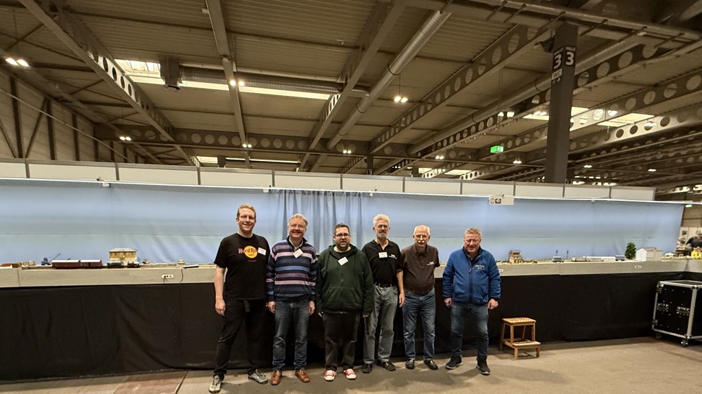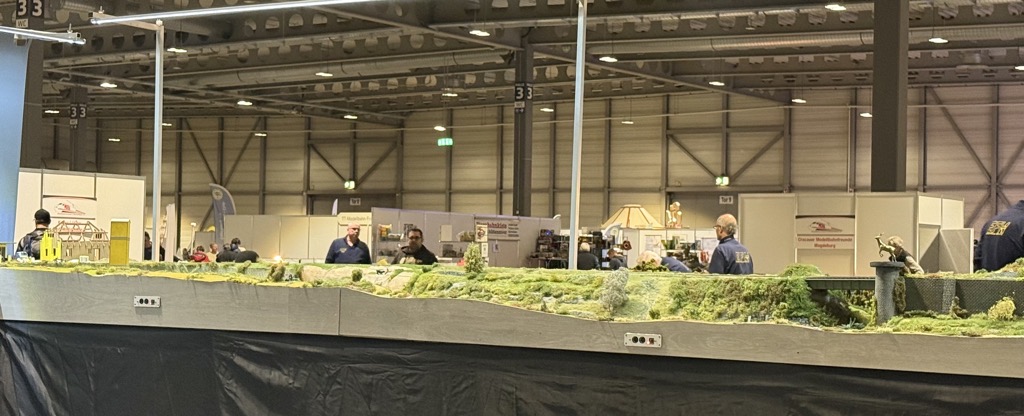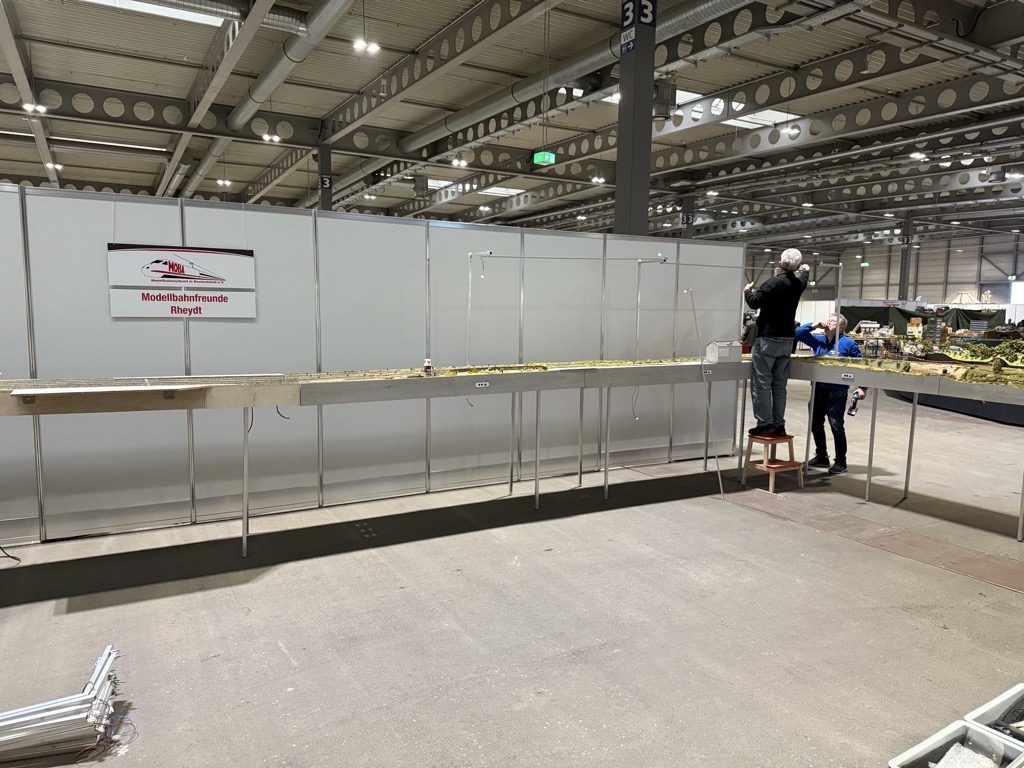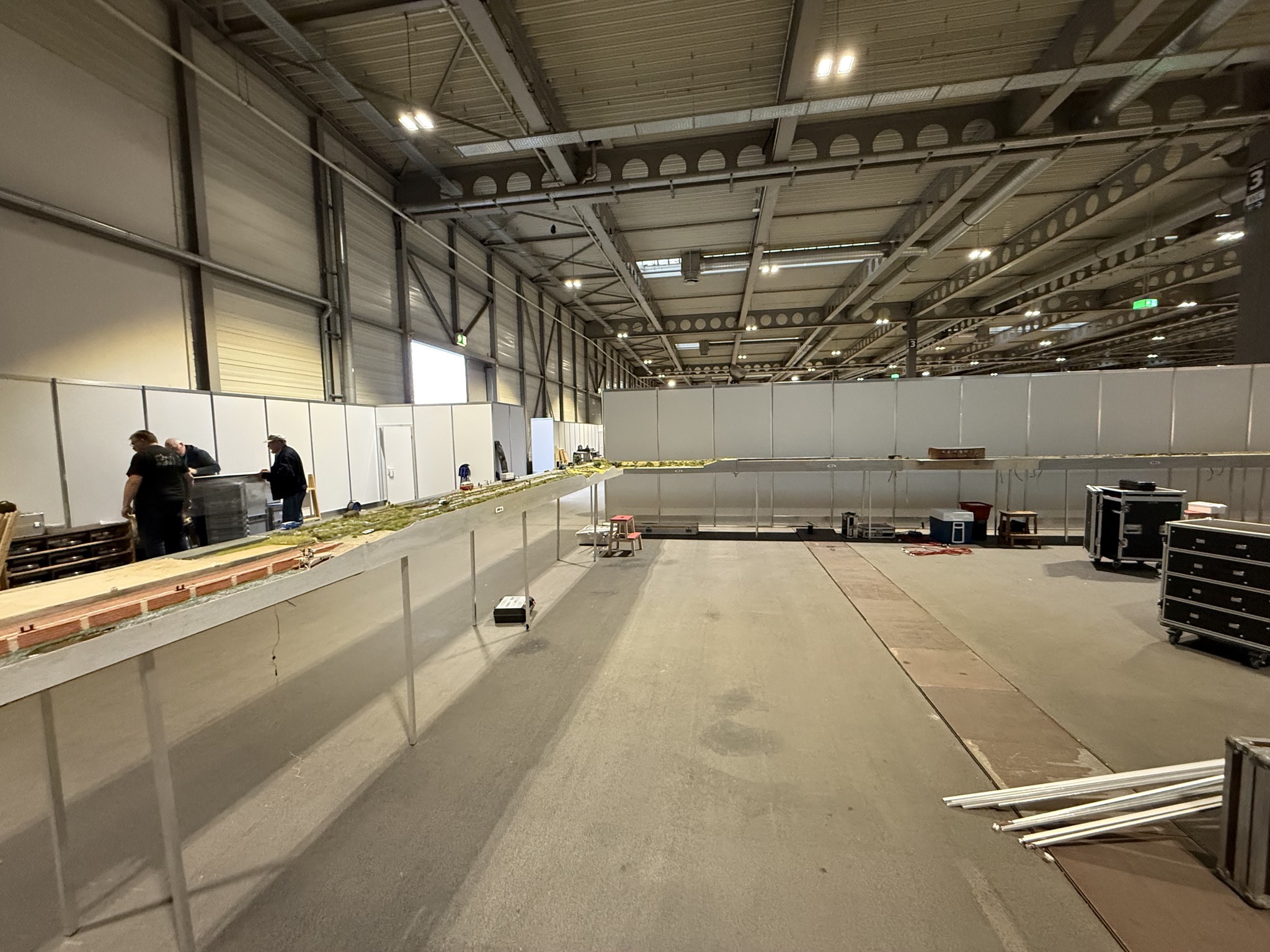 Nach einer kurzen Nacht und einem guten Frühstück sind wir um 08:10 Uhr in der Messehalle und bauen weiter an unserer Anlage. Und siehe da, um 09:45 Uhr ist alles erledigt. Die Hintergrundkulisse ist fertig montiert, unsere mobile Küche in der Kabine ist aufgebaut und die Besucher können kommen. Jetzt noch Strom auf die Anlage und es kann gefahren und rangiert werden. Noch ein paar kleinere Nachjustierungen und schon geht es los.