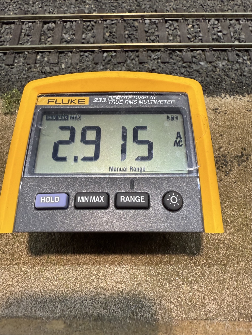 2,9A Spitzenstrom aus einem 3,2A Trafo klingt zwar machbar, jedoch nach einen schlechten Idee. Da wir keinen anderen Trafo dabei haben, mussten wir das rollende Material reduzieren, um die Belastung zu verringern. Danach waren wir mit 2,2A deutlich geringer, jedoch immer noch im „gelben Bereich“.