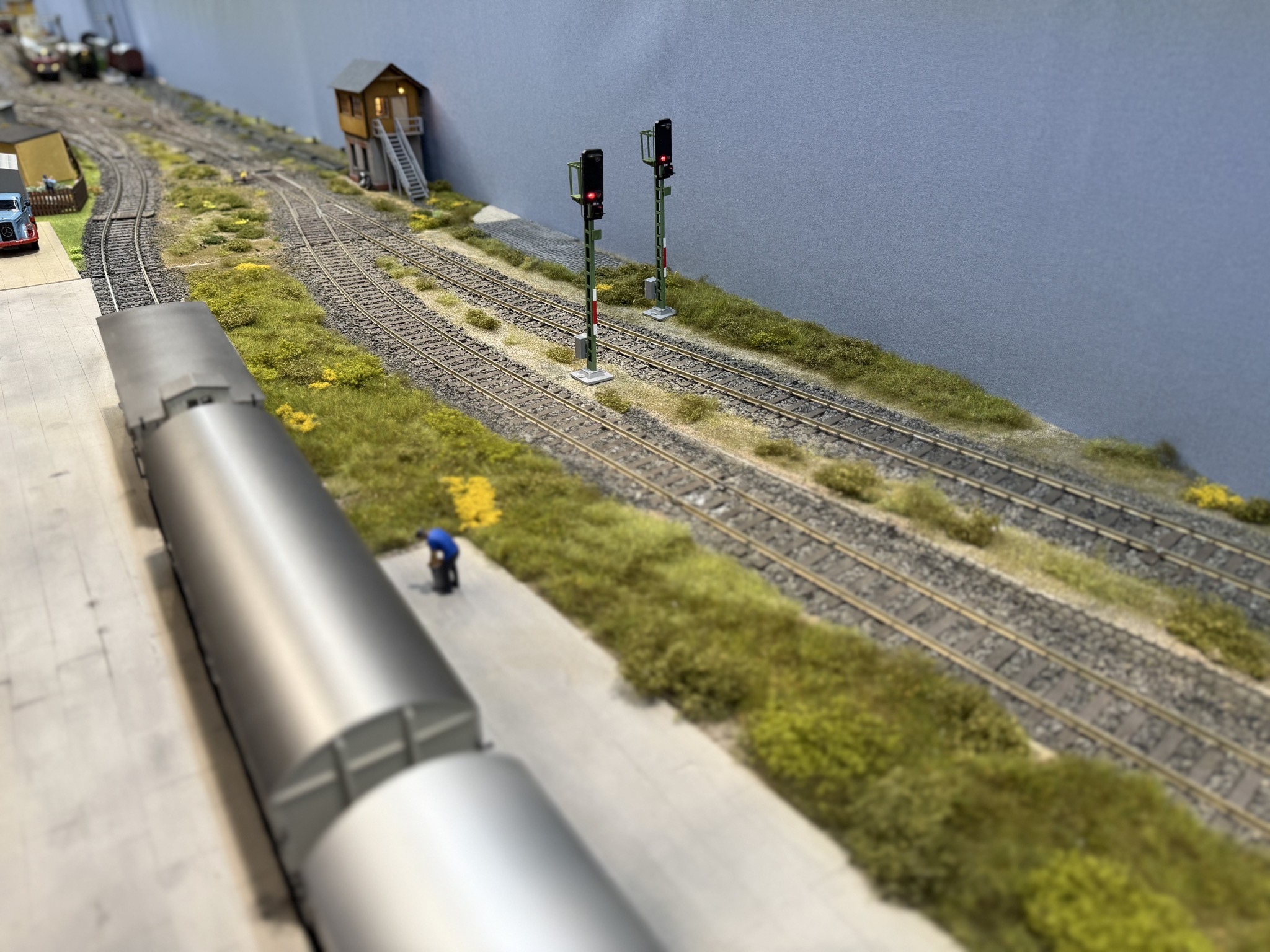 Versucht man die Anlage einzuschalten, wenn alle Fahrzeuge auf den Gleisen stehen, dann ist der Einschaltstrom so groß, dass die Zentrale einen Fehler meldet und in den „Stopp“ Zustand geht. Also, wird die Anlage elektrisch in 2 Abschnitte unterteilt die zeitlich versetzt eingeschaltet werden. Danach läuft dann alles. Meistens.