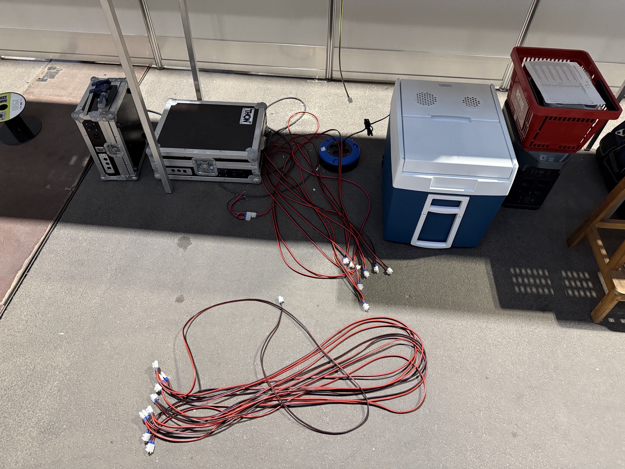 Die geplanten restlichen Arbeiten an der Anlage sind soweit abgeschlossen. Die Flightcases sind gepackt. Unsere Hintergrundkulisse ist gestern vom Nähen zurück gekommen und die Lichtgalgen sind ebenfalls fertig. Es wird gepackt.