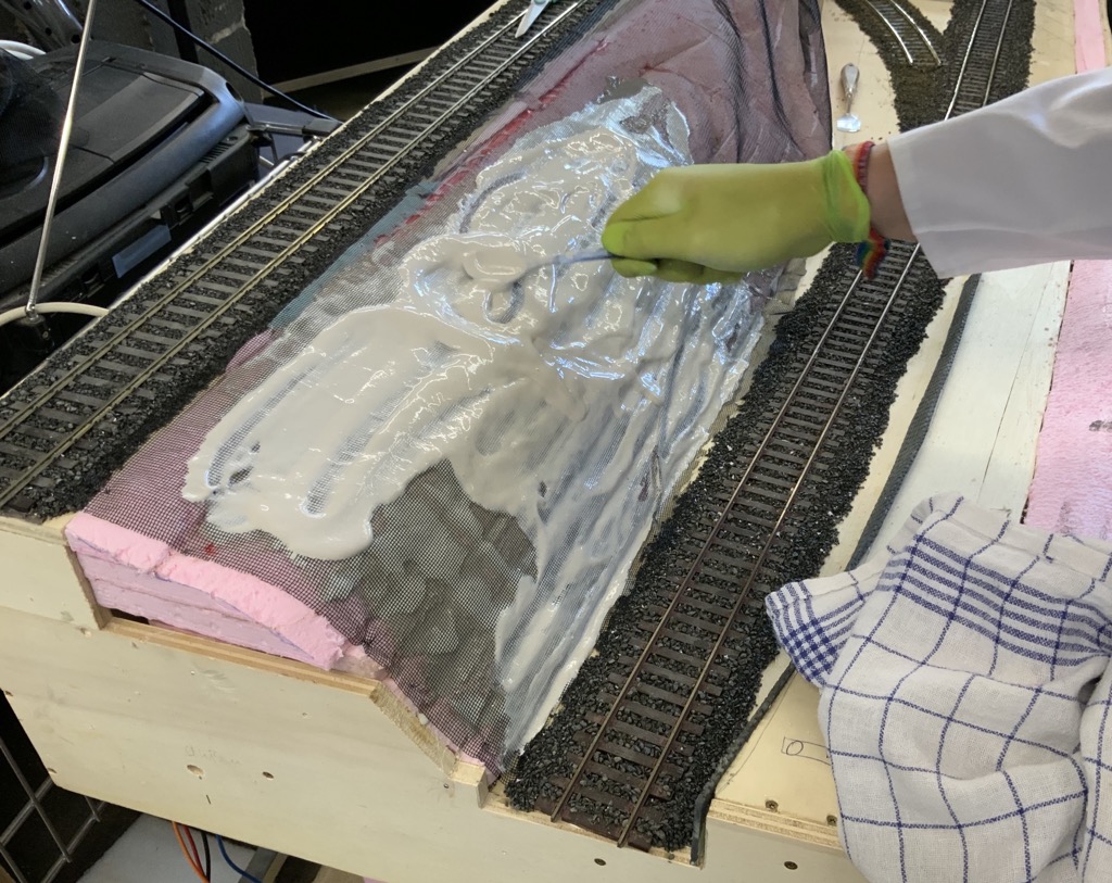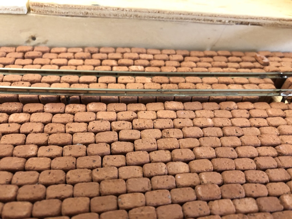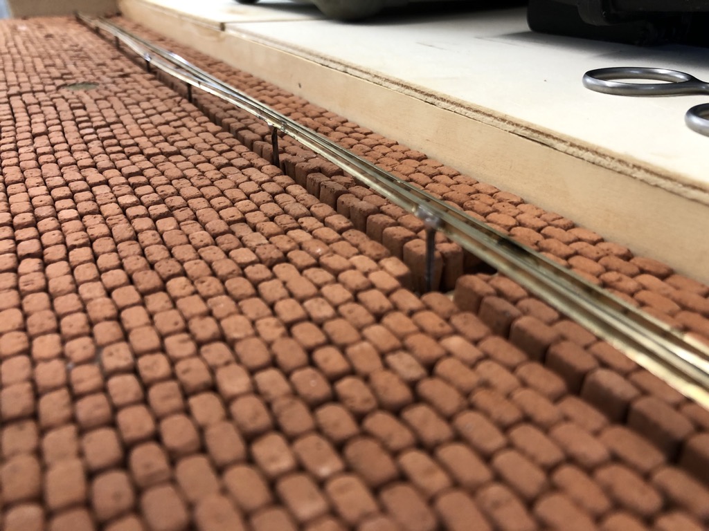 Die Gleise wurden auf Anregung eines Bauberichtes im Spur Null Magazin auf einem dünnen Acrylbett verlegt und mittels Holzspangen bis zur Aushärtung des Klebers (ca. 24 Stunden) fixiert. Anschließend wurden die Gleise mit gemahlenem und gesiebten Basaltsplit (Körnung 1-1,5mm) geschottert und mit Leimwassergemisch verklebt.
